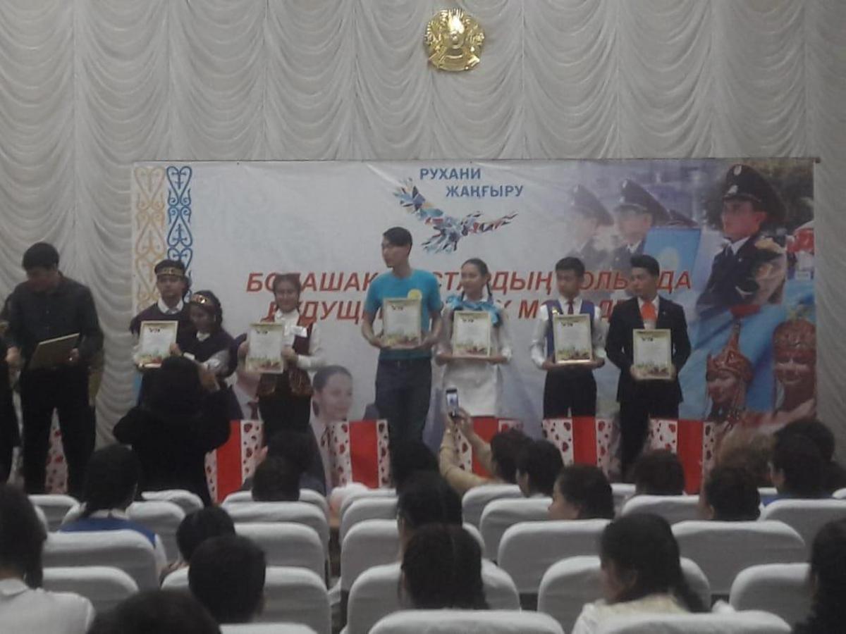 Алматы білім басқармасының ұымдастыруымен өткен «Болашақ жастардың қолында» атты қалалық фестивальінде «Үш тілді қатынас жолын насихаттау» номинациясы