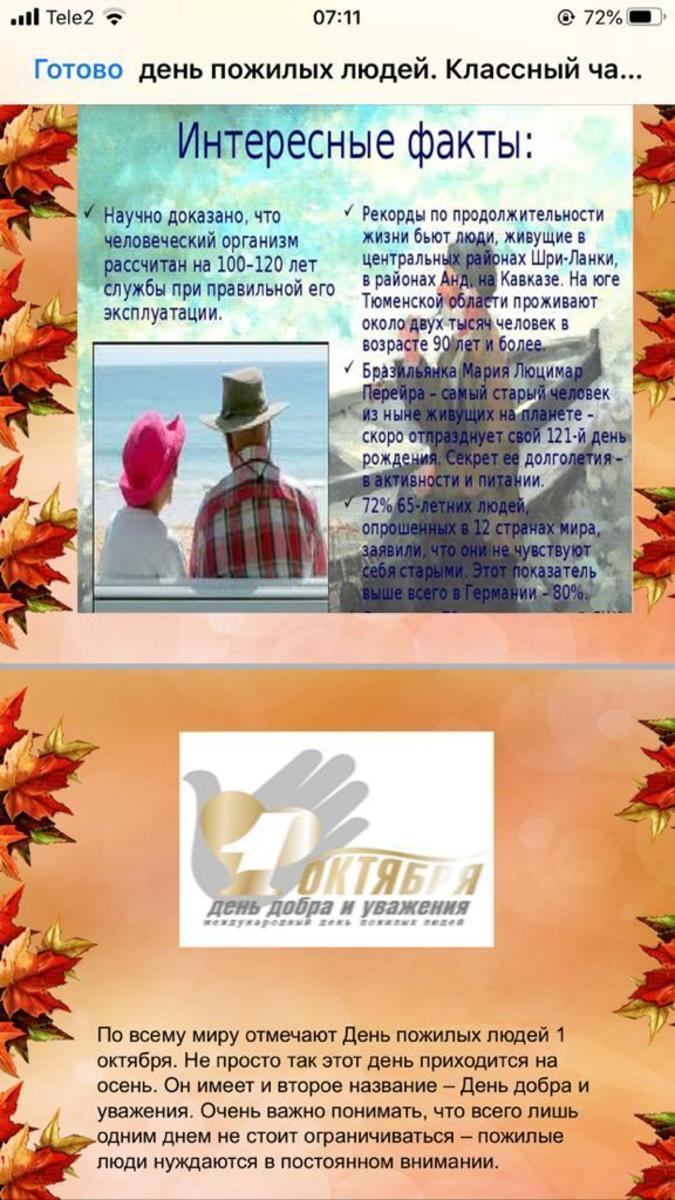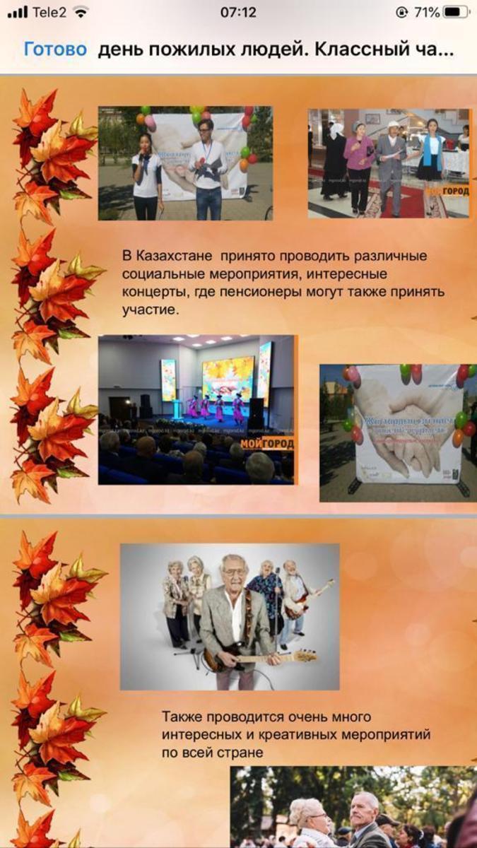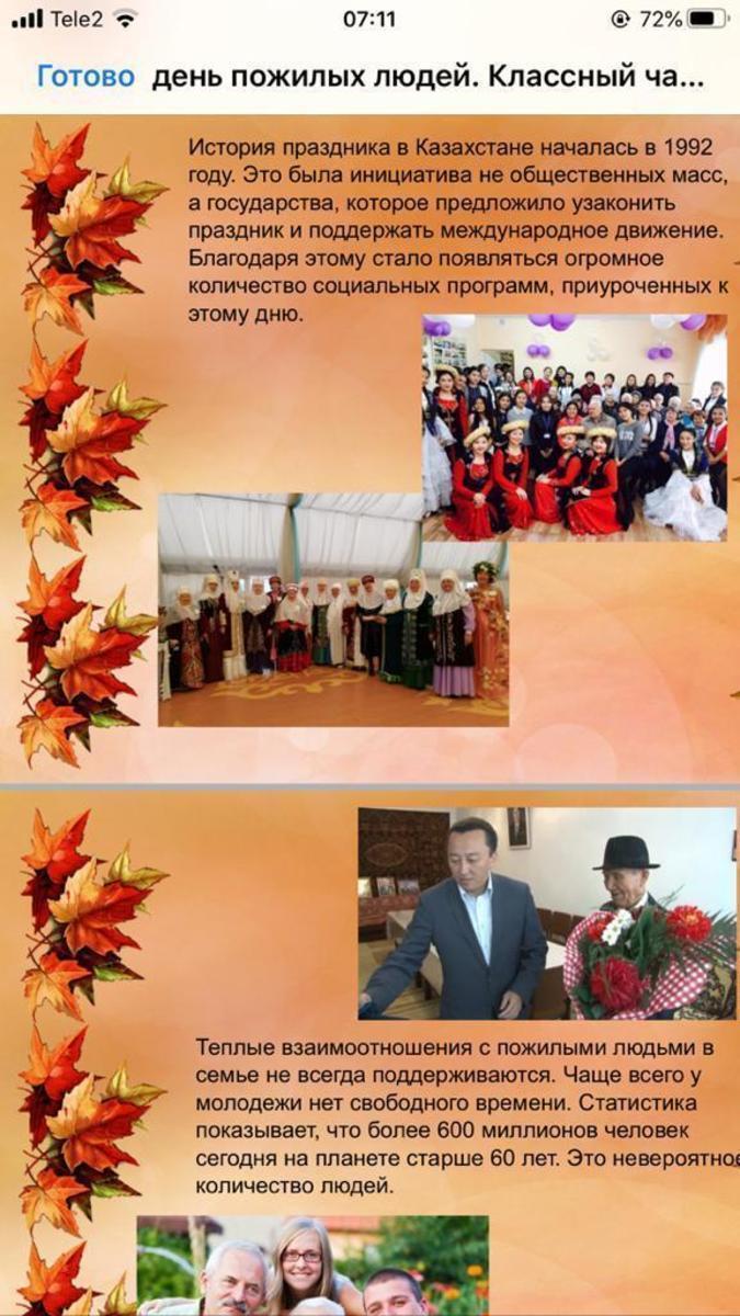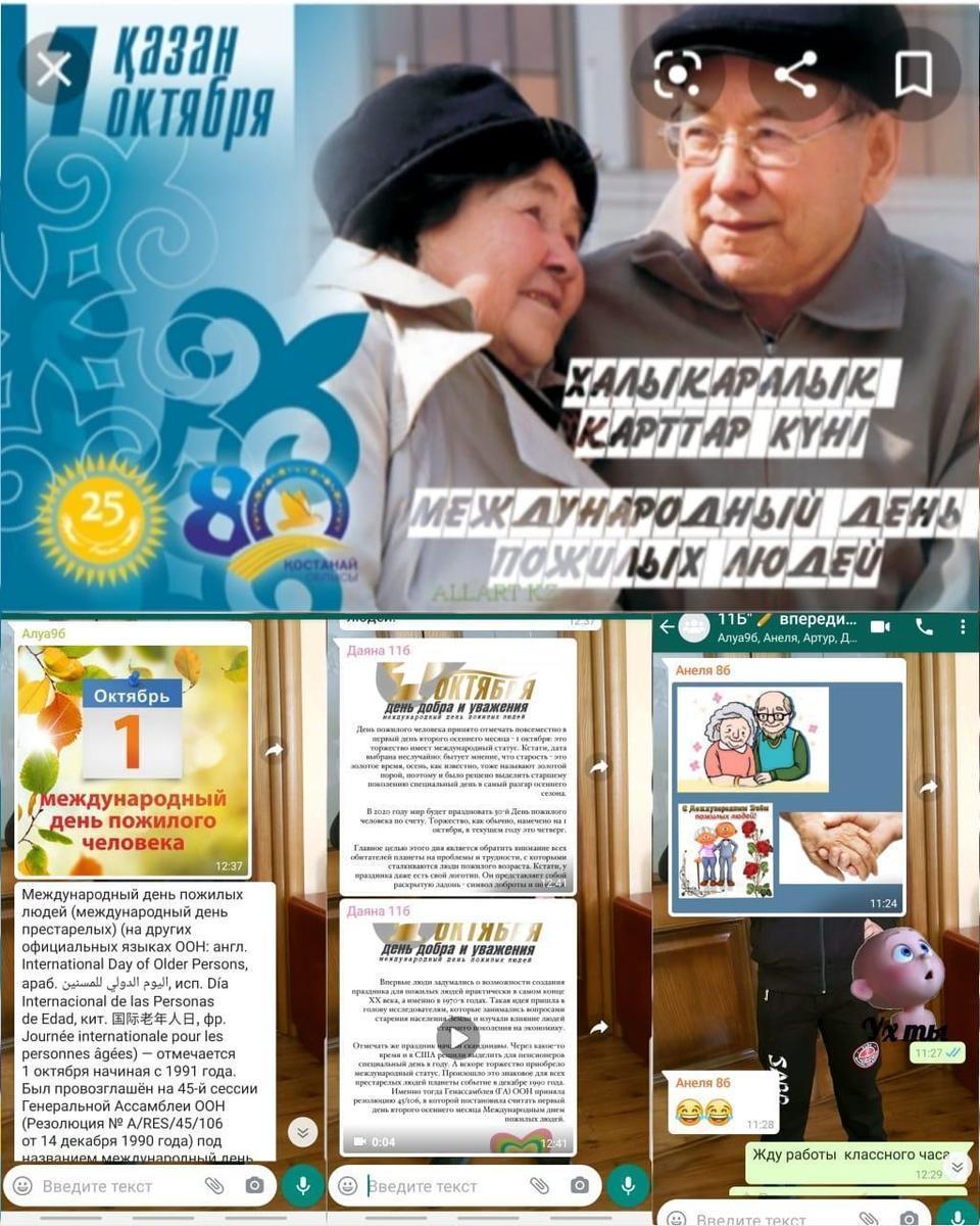 Ортамызда жүрген қарияларымыздың бір кезде елі, халқы, келешек ұрпағы үшін жасаған игі істері ерекше орын алады. Қазіргі кезде біздің мемлекетімізде қарттарға үлкен мән беріп, көңіл аударып, жан- жақты үкімет тарапынан қамқорлық жасалуда. Қазақстанның өсіп- өркендеуіне, еліміздің бейбітшілік тыныш өмір кешуіне өз үлестерін қосқан осы ардақты да аяулы қарттарымыздың арқасы деп есептейміз. Осы мақсатта мектебімізде қарттар күніне арналған арнаулы бір айлық іс-шаралар өткізілді. Іс-шаралар барысында сынып жетекшілер оқушыларға қарттарды сыйлау қажеттігін, оларға көмек көрсету парыз екендігін барынша түсіндірді.