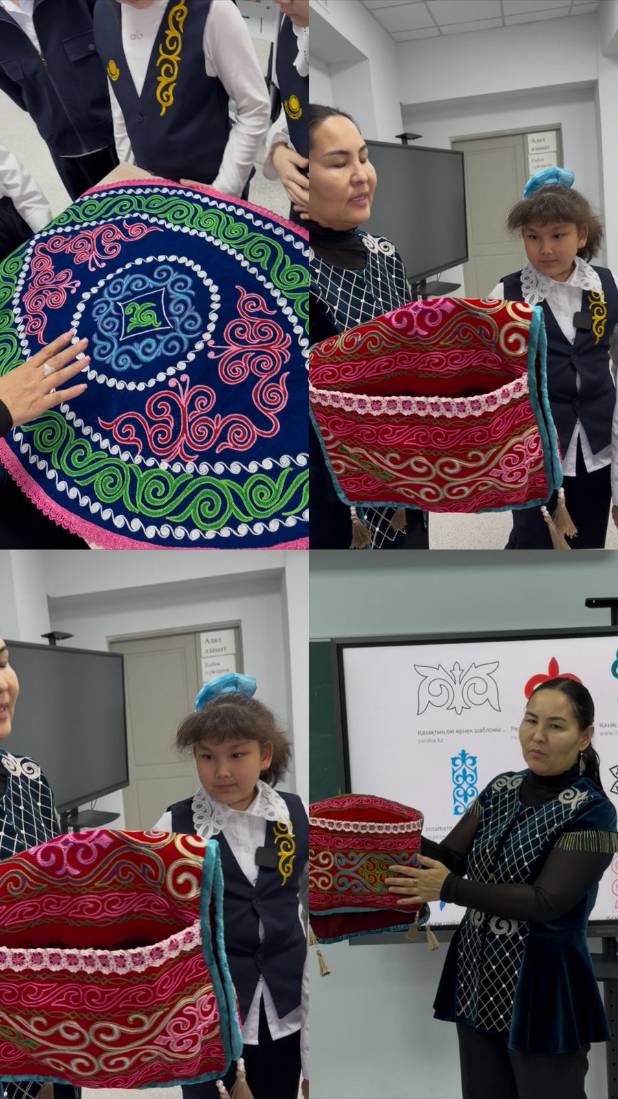 Оқушыларға «қошқар мүйіз», «түйе табан», «ирек», «сыңар мүйіз» сияқты кең тараған ою-өрнектер көрсетіліп, олардың нені білдіретіні айтылды. Сонымен қатар балалар өз қолдарымен ою-өрнек салып, шығармашылық қабілеттерін дамытты.