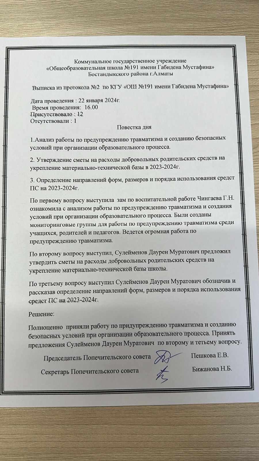 Қамқоршылық кеңесінің №1 жиналысының хаттамасы