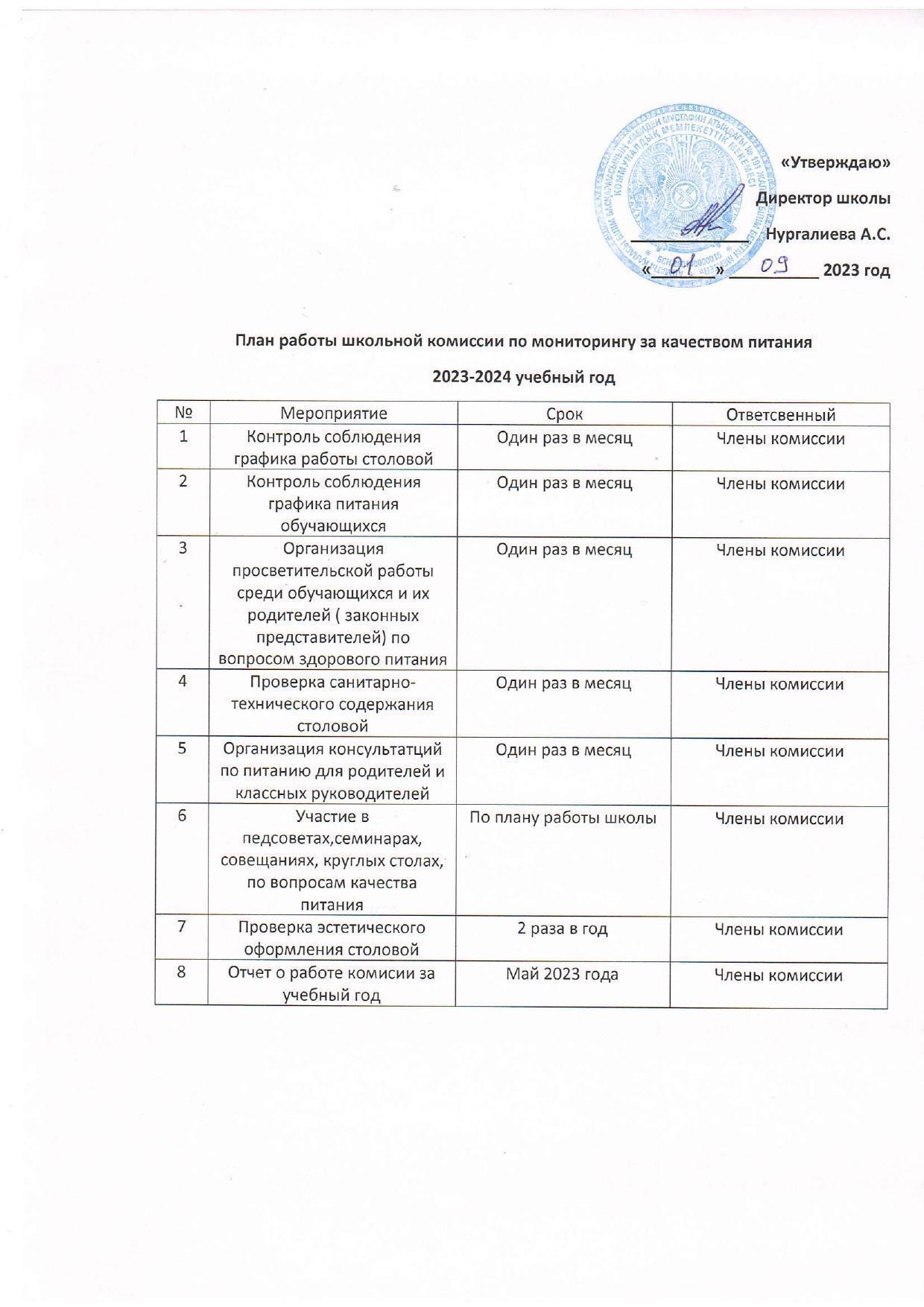 » План работы бракеражной комиссии за 2023-2024 учебный год