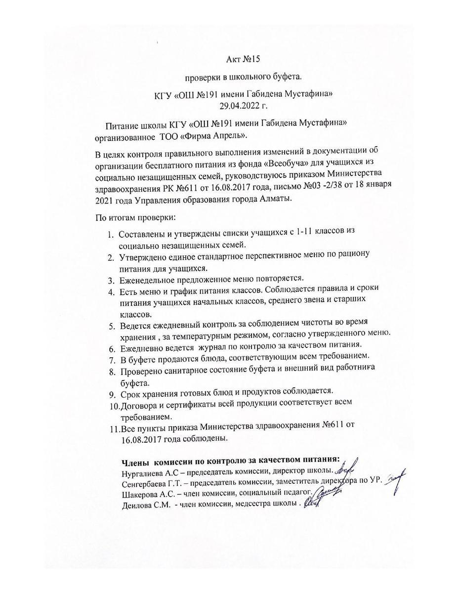 » АКТ № 15 29.04.2022 г проверки школьного буфета