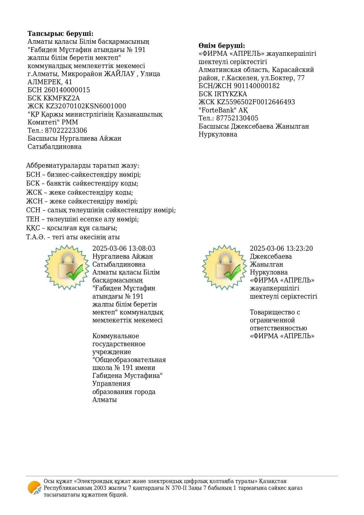 "Ғабиден Мұстафин атындағы №191 жалпы білім беретін мектеп" коммуналдық мемлекеттік мекемесі Бостандық ауданы